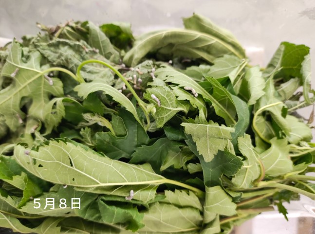 5月3日 卵から幼虫がかえりました。1齢幼虫です。カイコはクワの葉を食べながら約30日でまゆに