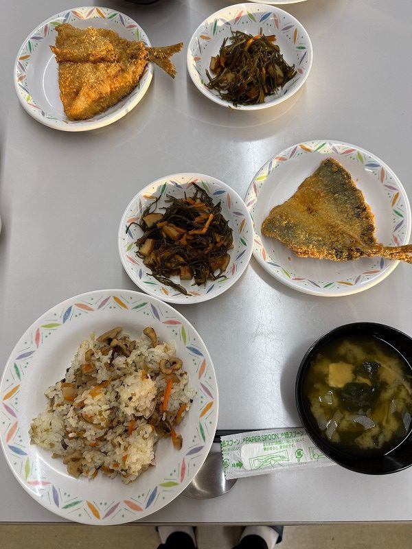 大貫のおいしい夕食です。メニューはアジフライとはかりめご飯(穴子)、昆布の煮物、お味噌汁です。