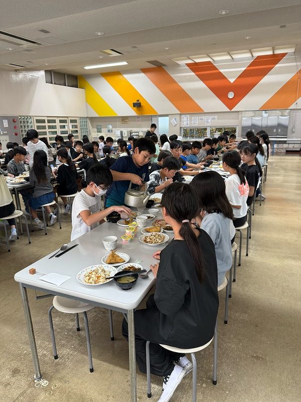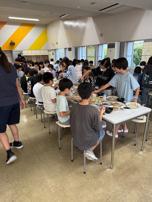もうみんなお腹ぺこぺこでした。係当番が夕飯の支度をしました。みんなおいしそうに食べています。