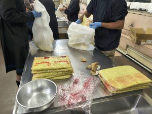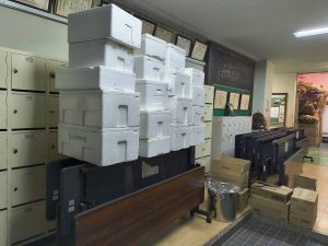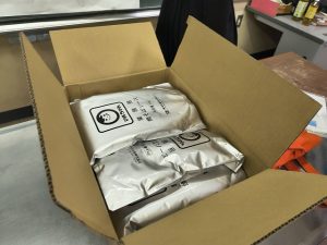 冷凍されたフランクフルト。これから箱を開いて並べて解凍していきます。