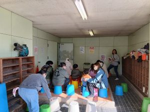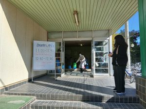 体育館の外出入口を使って「くすのきお話会」によるお話会が開かれました。