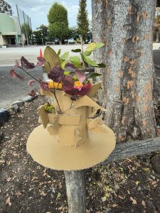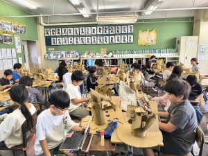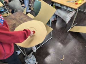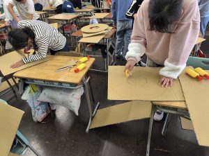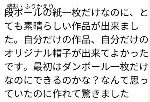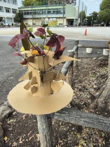 4年生は2学期に1枚のダンボールを使って「森の妖精の帽子」を作りました。