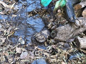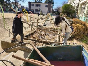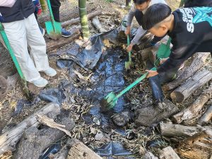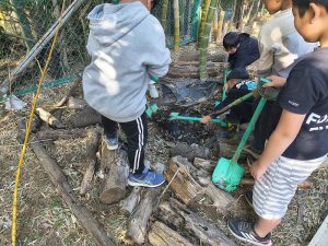 3年生の新校舎裏のビオトープの意見です。たまった落ち葉をすくいとることにしました。