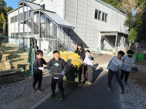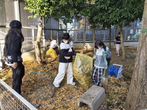 ここは3年生の校舎に通じる通路横の池です。底にたまったギンナンは泥をかきだして