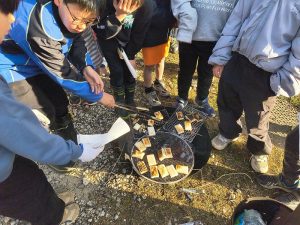 その火で竹炭を作り、炎がおさまったところでお餅を焼きました。