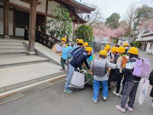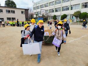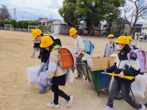 3月19日下校の時間にリヤカーに学校でよびかけて集めた食品を運びました。