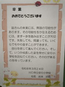 今日、6年生143名が安行小学校を卒業して中学校へと羽ばたきます。