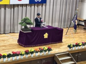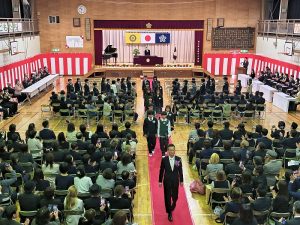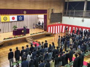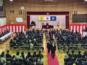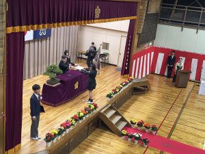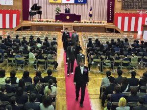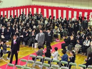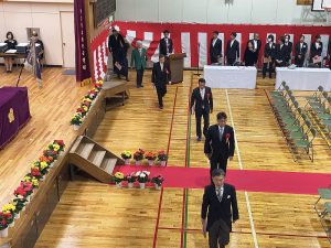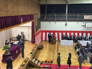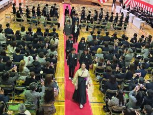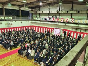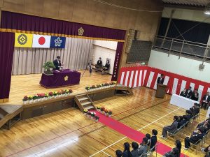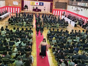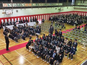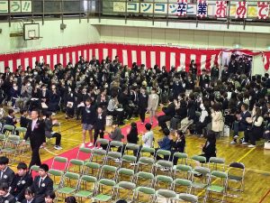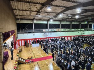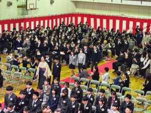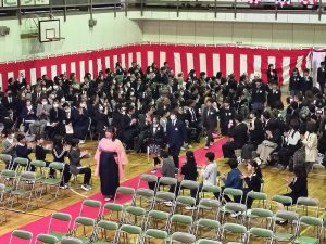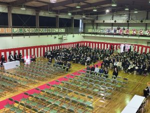 卒業式会場です。保護者の皆さんが朝早くから準備して入場しています。